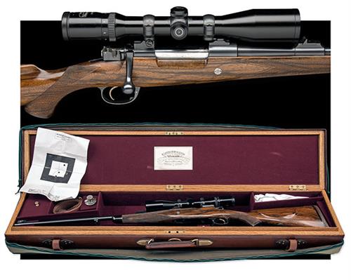 22 1/4in. nitro barrel engraved 'B. LAUBSCHER & ASSOC. RIFLEMAKERS', the knoxform gold-inlaid with the calibre designation, open sights and ramp-mounted bead fore-sight with folding protector, the receiver (with thumb cutout) mounted with a Schmidt & Bender 3-12x42 telescopic sight, serial no. 257490, floral engraved recoil blocks, hinged floorplate with push button release, pistolgrip stock with cheekpiece, steel pistolgrip-cap, sling swivels, 14 3/8in. pull including 73/4in. rubber recoil pad, weight 9lb., in its full length brass-cornered oak and leather case with padded cloth outer cover