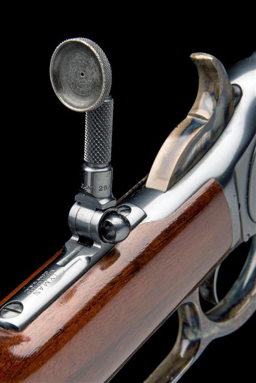 for 1883, with round 22in. blued barrel, dove-tailed blade fore-sight, elevating ladder rear-sight, the top of barrel signed 'WINCHESTER'S REPEATING ARMS CO. NEW-HAVEN CT' and 'KING'S IMPROVEMENT' with patent dates to '1860', London period proofs, plain slab-sided receiver, sliding dust cover, top-tang fitted with a period adjustable 'LYMAN' peep-sight, walnut butt-stock with iron shotgun heel-plate, colour hardened finger-lever (virtually full colour remaining), plain walnut fore-end with iron nose-cap, full-length under barrel magazine, the whole retaining the majority of its factory finish but with some large areas of finish loss and surface corrosion, mainly to the left hand side