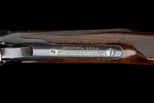 for 1907, with blued round 22in. barrel, dove-tailed 'LYMAN' folding ring fore-sight, buckhorn rear-sight, the left-hand side of barrel signed 'MANUFACTURED BY THE WINCHESTER REPEATING ARMS CO. NEW HAVEN CONN. USA PATENTED AUGUST 21 1894', slab-sided blued action with central hammer and fitted with a contemporary 'LYMAN' receiver sight, top-tang marked 'MODEL 1894, WINCHESTER, TRADE MARK REG. U.S. PAT. OFF. & FOREIGN', chequered walnut pistol-grip butt-stock with hard-rubber grip cap, iron crescent heel-plate, curved under-lever, plain trigger, chequered walnut fore-end with iron cap, full-length magazine with take-down lever at tip, fitted with eyelets for the Winchester sling (absent), strong amount of finish remaining