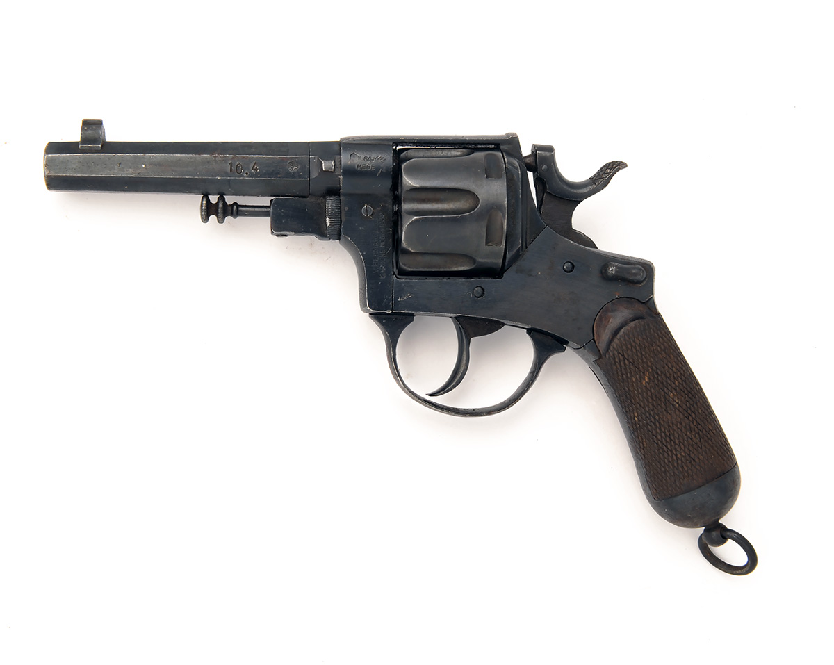 A 10.4mm (ITALIAN ORD.) DOUBLE ACTION REVOLVER SIGNED V. BERNADELLI, MODEL '1932 POLICE', serial no. 5939, with blacked 4 1/2in. octagonal barrel, solid frame marked 'RA GUARDIA DI FINANZA) (Bank Guards), fluted cylinder and chequered walnut grip with heavy domed iron pommel