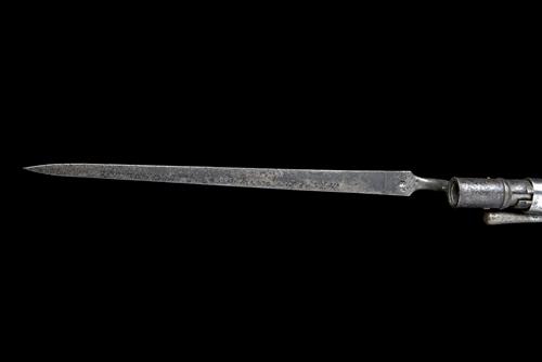 circa 1840, with 41in. round iron barrel, Zurich canton stamp at breech, plain military style lock possibly converted from flint (at fault), walnut three-quarter stock with dished cheek-piece (repaired crack forwards of sideplate on left), iron furniture including finger-grooved trigger-guard tang, two barrel bands and twin banded nose-cap with applied brass fore-sight and under barrel ramrod, together with a period socket bayonet, (rusted, missing scabbard) and a period leather sling