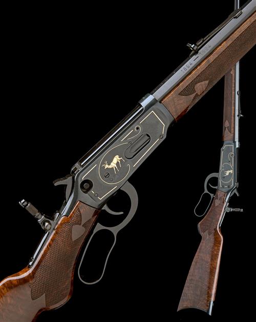 high-grade version produced in 1994, with blued half round, half octagonal 26in. barrel, the top-flat signed 'MANUFACTURED BY THE U.S. REPEATING ARMS CO., NEW HAVEN CT. USA', the left top flat marked 'WINCHESTER PROOF STEEL ESPECIALLY FOR SMOKELESS POWDER', dove-tailed blade fore-sight, buckhorn rear-sight, blued receiver with push-through safety and etched with scrolls around gilt bordered panels of mouflon and deer, each animal also gilded, folding peep-sight mounted to the top-tang, chequered highly-figured walnut pistolgrip butt-stock with crescent heel-plate, matching chequered walnut fore-end and half-length magazine, in its maker's card carton appearing unused