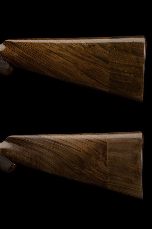 27 7/8in. nitro reproved chopperlump barrels, ribs engraved 'JOHN POWELL GUNMAKER REIGATE' and gold-inlaid '1' and '2' at the breech ends, 2 3/4in. chambers, bored approx. imp. cyl. and 1/4 choke, manufactured by Grulla Armas with Holland & Holland style self-opening systems, actions with removable striker discs, sculpted toplevers gold-inlaid '1' and '2', automatic safeties with gold-inlaid 'SAFE' details, hand-detachable lockplates (No.1 with replacement non hand-detachable lock screw), articulated front triggers, fine floral and acanthus scroll engraving, the lockplates with finely engraved game scenes of woodcock and partridge, duck and pheasant, signed 'CASBARD', bright finish, 17in. figured semi-pistolgrip stocks including 3in. wooden extensions, weight 7lb. 8oz. (No.1) and 7lb. 6oz. (No.2), in a universal motor case