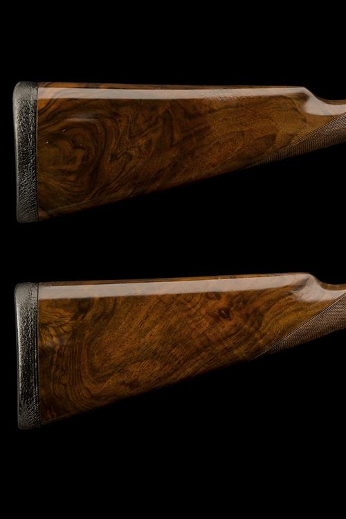 30in. nitro reproved barrels, rib engraving indistinct, gold-inlaid '1' and '2' at the breech ends, 2 1/2in. chambers, bored approx. 1/4 choke in both (No.1) 1/4 and 1/2 choke (No.2), (No.1 wall thickness at 18), treble-grip actions, toplevers gold-inlaid '1' and '2' automatic safeties with gold-inlaid 'SAFE' details, intercepting sears, removable striker discs, bouquet and scroll engraving, brushed finish, 15 1/2in. replacement stocks including 5/8in. leather-covered recoil pads, bolstered fore-ends, slight damage to No.1 fore-end wood, weight 6lb. 5oz. (No.1) 6lb. 7oz. (No.2)