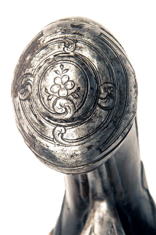 French, circa 1790, with slightly shortened 7 1/8in. re-blued barrels, engraving at the breech-end and along rib (rubbed), deep eared sighting groove to top-tang, flat borderline and scroll engraved locks, lozenge-shaped pans, engraved hammers and frizzen-fronts, walnut full-stock florally carved around the top-tang and with carved borders around the furniture (inlet repair to fore-end tip), engraved iron long-eared butt-cap, pillar-fronted engraved iron trigger-guard tang and bow and later replacement iron ramrod