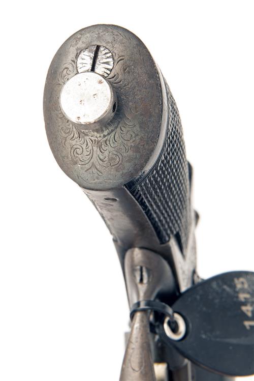 circa 1875, collection reference 1415, with reblued octagonal 5in. barrel, the top-flat signed 'COGSWELL & HARRISON, 223 & 224 STRAND, LONDON', engraved band at muzzle, crescent fore-sight, sighting groove to the top-strap, plain reblued five-shot cylinder, borderline and scroll engraved frame, chequered walnut semi saw-handle grip, iron pommel-cap and guarded trigger, the ejector rod missing from pommel-cap and some replacement screws