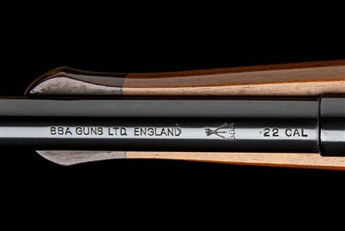 one of one thousand rifles made to celebrate the 100th anniversary of BSA in 1982, with blued 19 1/2in. barrel, ramp fore-sight (tunnel protector absent), micro-adjustable rear-sight, tap-action loading, the air-chamber marked 'BSA PILED ARMS CENTENARY ONE OF ONE THOUSAND', special edition chequered walnut three-quarter stock with raised comb and cheek-piece, pistol-grip with special 'BSA piled arms' cover, ventilated rubber recoil pad, rosewood schnabel fore-end tip and appearing unfired, together with its original issue 'BSA' 4x40 telescopic sight and mounts, its original instructions and limited edition certificate papers, bullion badge, special leather sling with 'Q.D.' swivels, sample oil-bottle, target holder with targets and original vinyl gunbag (one carry handle at fault), the whole contained within the original maker's card carton