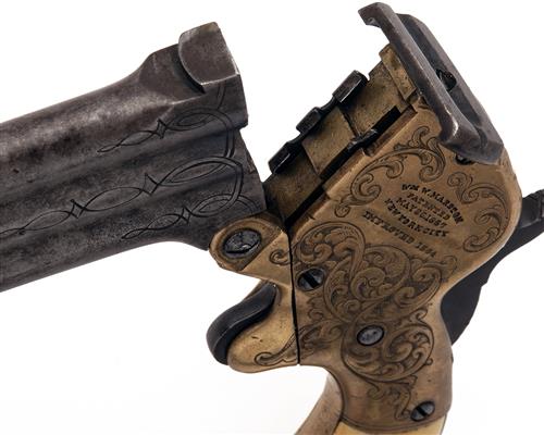 for circa 1864, with hinged moulded vertically stacked 4in. three-barrel group, engraved band at muzzle and open arabesque scroll engraving at breech-end, small applied crescent fore-sight, rotating dove-tailed locking catch with central sighting groove mounted to top of the brass receiver, the side with full American scroll coverage around the details 'WM. W. MARSTON PATENTED MAY 26 1857 NEW YORK CITY IMPROVED 1864' on the left hand face and blued rotating barrel selector on the right, spur trigger, external blued hammer, brass grip-straps fitted with period ivory grips and further engraving along the back-strap, traces of blued finish to iron parts