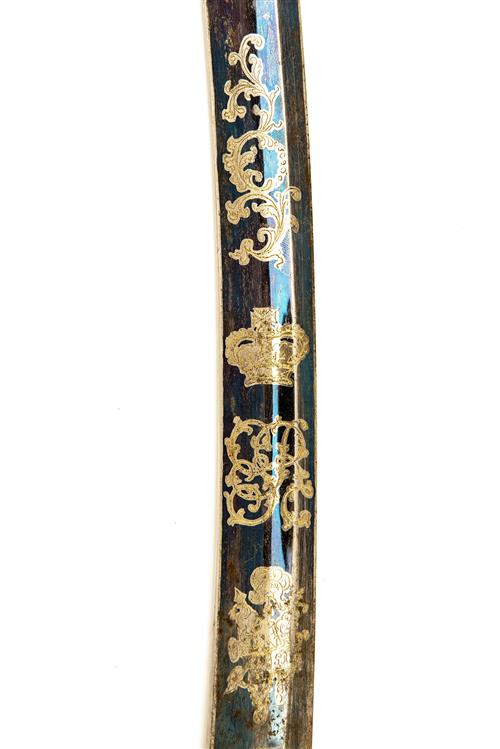 circa 1805, with broad strongly curved 32 1/2in. blade broadening at the tip, broad shallow fuller for the majority of its length, the first two fifths decorated with gilt filled martial etchings on a blue ground (left side faded), gilded maker's details below the broad langets (signature obscured), 'P' shaped iron knuckle-bow with straight cross-guard and rolled quillion, wire-bound leather grip, plain back-strap with side extensions and doveshead pommel (some staining and corrosion to hilt), complete with its iron service scabbard, the left hand side with oval makers panel near throat, possibly signed 'GILL'