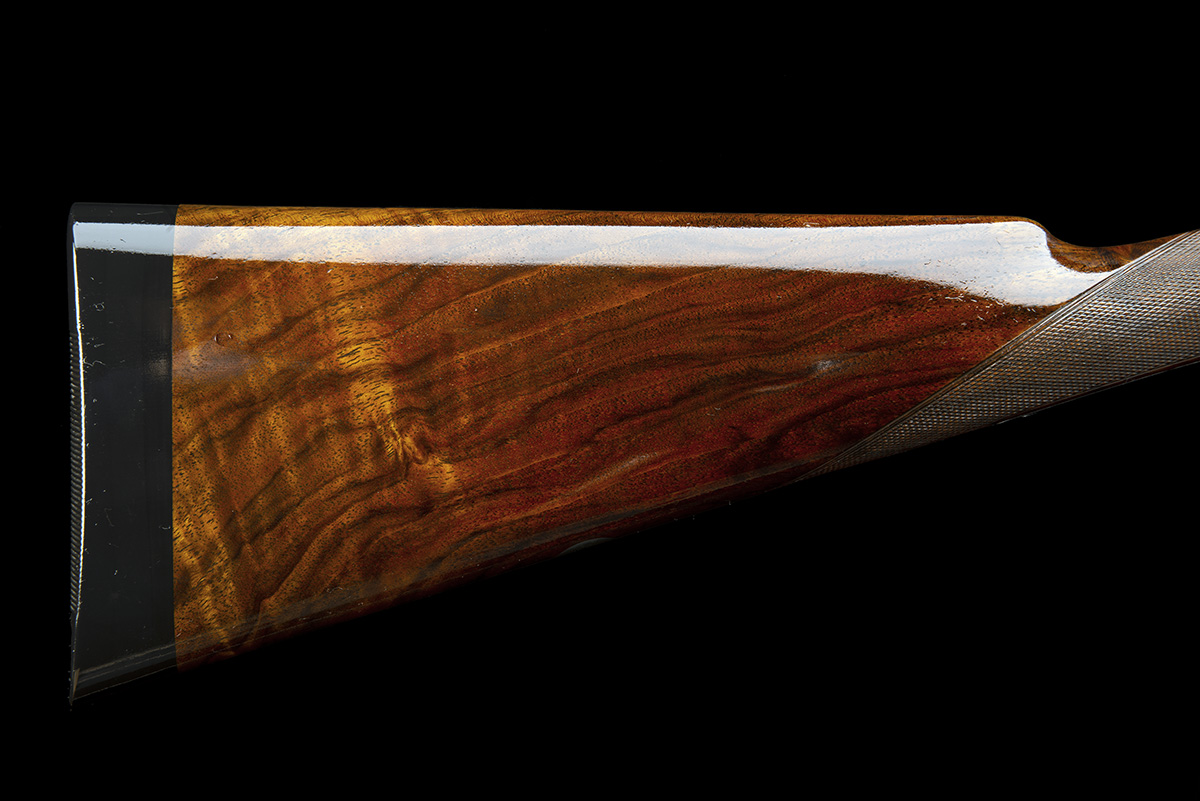 28in. nitro reproved barrels (in 2019, partially struck off), rib engraved 'ARMY & NAVY C.S.L. LONDON.', 2 1/2in. chambers, bored approx. imp. cyl. and 3/4 choke, removable striker discs, automatic safety with inlaid brass 'SAFE' plaque, fine border and acanthus scroll engraving, retaining traces of original colour-hardening, 15 1/2in. figured stock including 1in. ebonite extension, weight 6lb. 12oz.