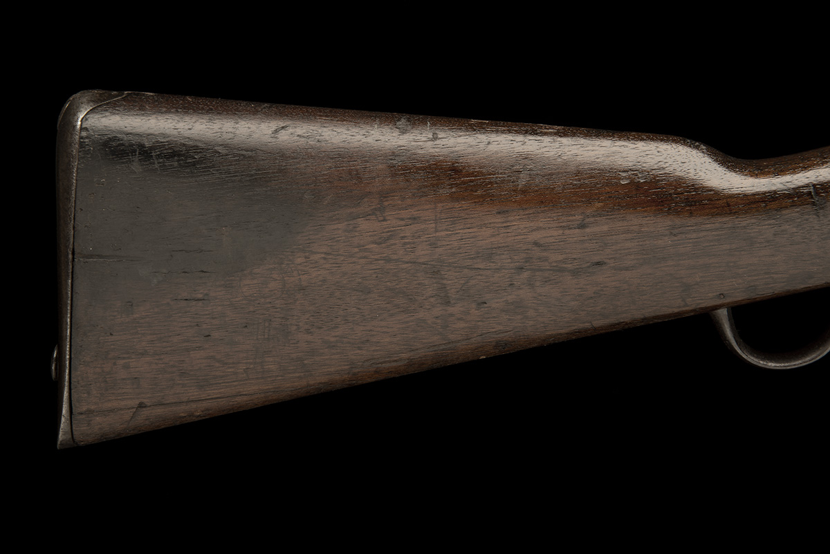 dated for 1888, with 33 1/4in. barrel, block and blade fore-sight, elevating ladder rear-sight, slab-sided receiver with make and model details, walnut butt-stock, the left hand side stamped 'S.R.G.' together with a broad arrow, short under-lever, full length walnut fore-end, two iron barrel-bands and iron under-barrel clearing rod