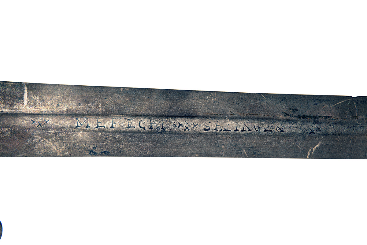 European circa 1640, with 36 1/2in. straight double edged blade, blind fuller for the first third, the fullers further engraved with stars and 'ME FECIT SALINGEN' (sic), stylised Solingen running wolf mark forwards of the fuller to both sides, the left hand side of the blade struck with an armourer's stamp, the right with a 'P' below a crown, typical pierced iron double kidney hilt with integral thumb-ring (both pierced panels re-attached), wire bound wood grip (wire loose), 'D'-shaped knuckle-bow and bulbous iron pommel, the whole dirty and stained