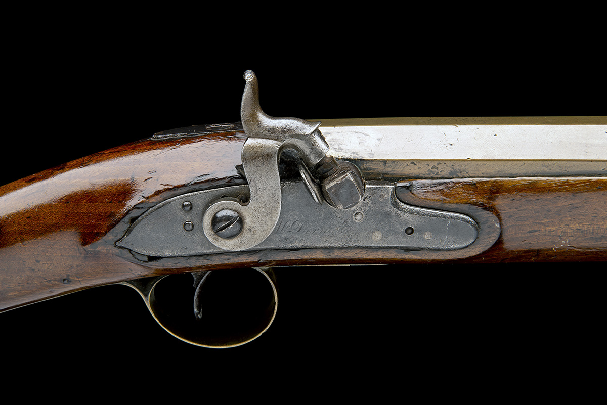 circa 1790 with later conversion to percussion via drum and nipple, 14 1/2in. octagonal to round barrel banded at the intersection and with banded cannon muzzle, the top-flat at breech signed 'DUBLIN' (rubbed), plain solid iron top-tang, iron lock signed 'McDERMOTT' in script (some mild pitting), plain slab-sided hammer, walnut full-stock with exposed muzzle, brass furniture (heel-plate dented), the trigger-guard tang engraved 'CASTLE McGARRETT' and probable replacement brass tipped wood ramrod