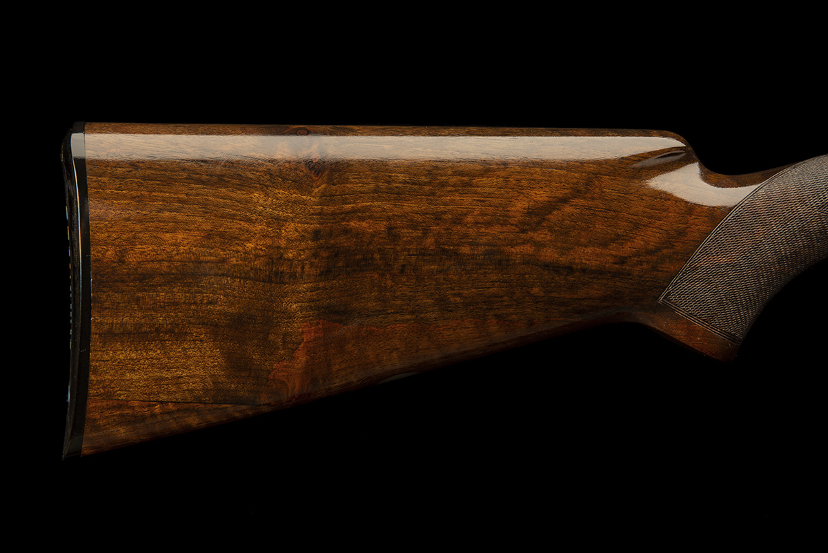 27 1/2in. nitro barrels with 12mm ventilated matt top-rib, 2 3/4in. chambers, bored approx. imp. cyl. and 1/4 choke, hold-open toplever, manual safety with gold-inlaid 'O', 'U' and 'S' detail, bouquet and scroll engraving, brushed finish, 14 1/4in. pistolgrip stock including buttplate, weight 7lb. 4oz.