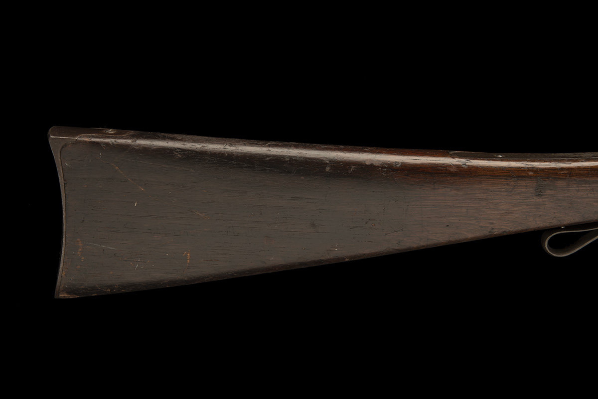 circa 1863/64, with octagonal to round 20in. tip-down barrel, dove-tailed blade fore-sight, flip-over 'L' shaped rear-sight, open iron action with offset central hammer and nipple, walnut butt-stock with martial cartouche stamps, iron heel-plate, serpentine under-lever acting as trigger-guard, side mounted saddle bar and ring, no provision for fore-end, strong amount of original finish remaining