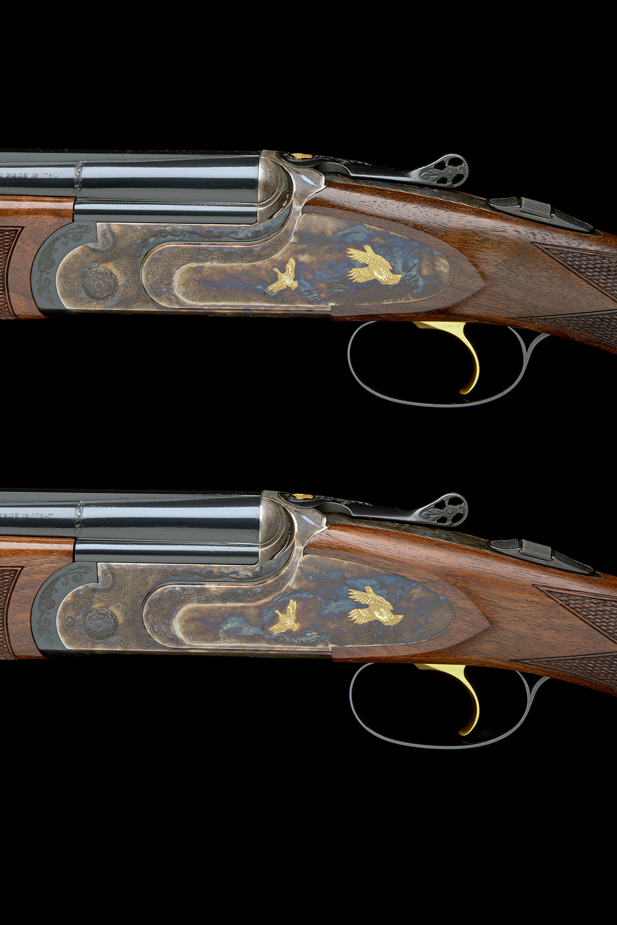 30in. nitro barrels with 5mm ventilated matt top-ribs, 2 3/4in. chambers, multichokes (with spares), hold-open toplevers pierced with roses and gold-inlaid with crowns, automatic safeties with integral barrel selector switches, gold-washed triggers, scrolling acanthus engraving surrounded gold-highlighted game scenes of partridge and woodcock, retaining virtually full original colour-hardening and finish, 14 3/4in. semi-pistolgrip stocks including 7/8in. ebonite extensions, weight 6lb. 5oz., in universal cases