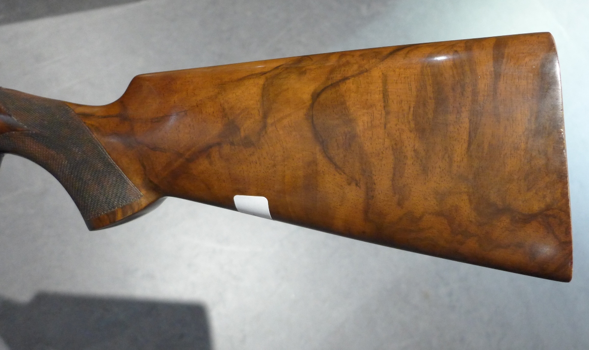 27 1/2in. nitro barrels with 6mm ventilated matt top-rib, the over barrel signed in script 'Fabrique Nationale Herstal' and with a thin gold band at the breech end, gold detailing to three-piece fore-end furniture and screw mounts, 2 3/4in. chambers, bored approx. 1/4 and 3/4 choke, hold-open toplever, manual safety with integral barrel selector switch, finely blacked action and sideplates carved in high relief and four colour gold-inlaid with game scenes surrounded by rococo style arabesques and gold line detailing, the left side with ruffed grouse, the right with pheasant and the underside with a lone mallard in flight, the triggerguard with a lynx, the left sideplate and triggerplate signed 'J. BAERTEN', 15in. well-figured pistolgrip stock with stitch border chequering, weight 7lb, in a Guardian oak and leather case with canvas outer