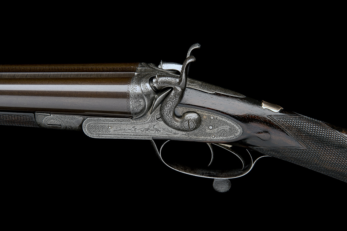 30in. nitro reproved damascus barrels, the rib engraved 'JAS. SQUIRES. 14. NEW CASTLE STREET. LONDON.' and with a flash of scroll engraving at the breech, 2 1/2in. chambers, bored approx. true cyl. in both, Jones patent rotary underlever, carved percussion fences non-rebounding locks (one hammer a replacement), border and acanthus scroll engraving surrounding game scene vignettes and the makers name engraved within a scrolling banner, Deeley & Edge patent fore-end release, 14 1/2in. figured stock including buttplate, weight 6lb. 13oz.