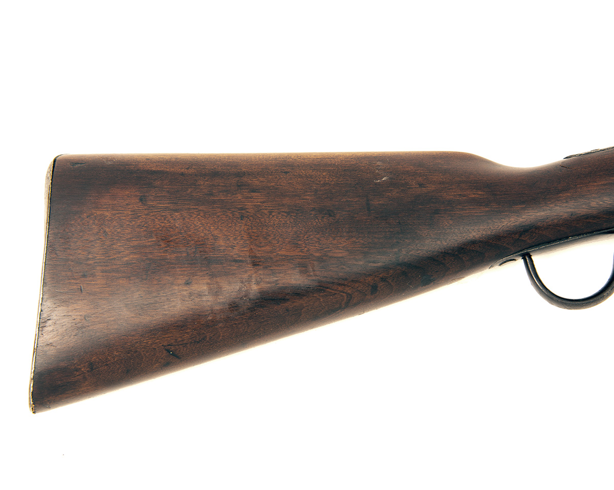 circa 1890, with round 24in. barrel, block fore-sight, short 'Africa' rear-sight with ladder, standing notch and two flush folding leaves, borderline engraved slab-sided action, the centre of the left hand side marked 'SWINBURN'S PATENT', safety catch and cocking lever combined to right hand side, working replacement straight hand butt-stock, smooth iron heelplate, short under-lever, walnut splinter fore-end and eyelets for sling, the metalwork cleaned with some loss to detail