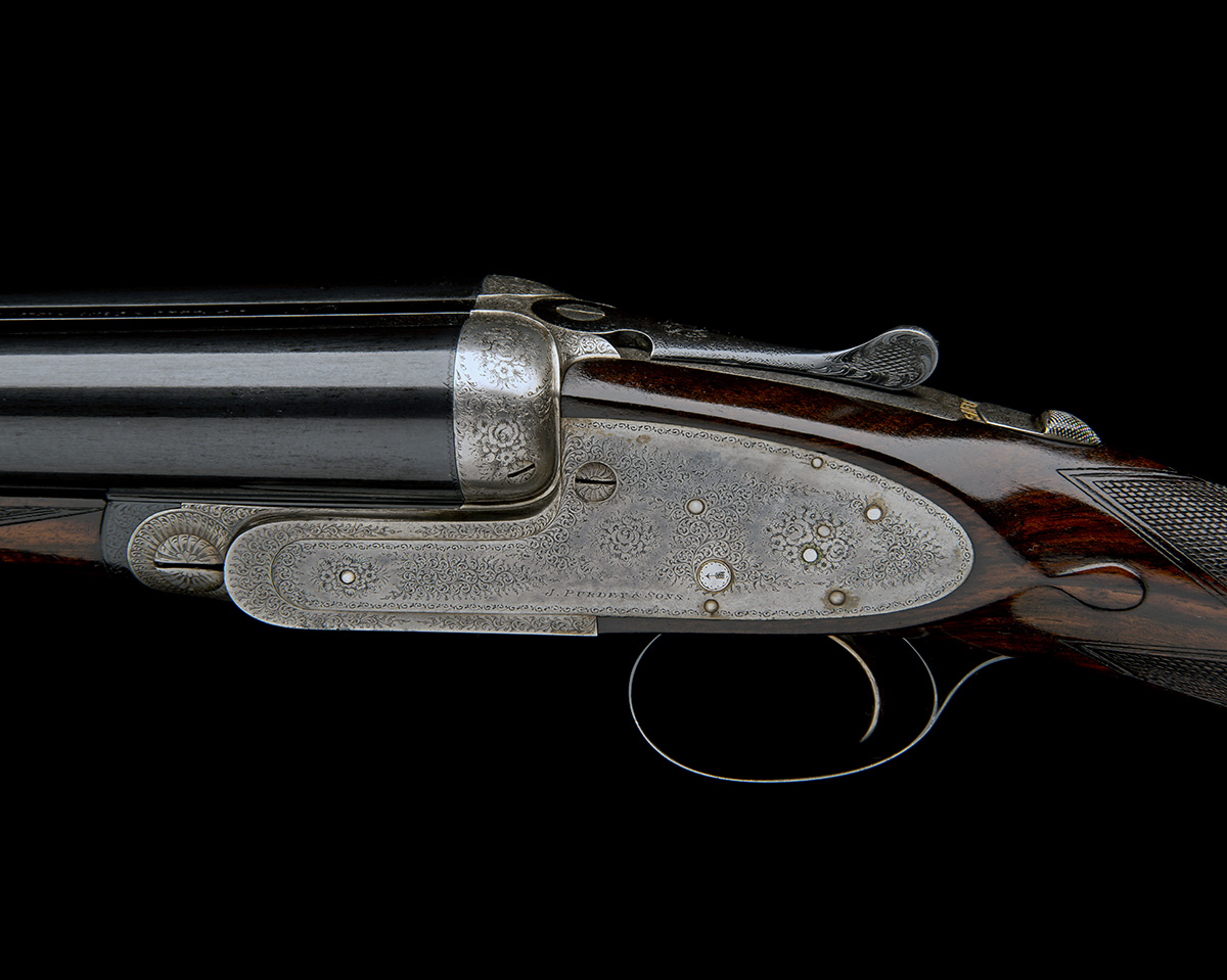 28in. nitro reproved chopperlump barrels, rib engraved ''J. PURDEY & SONS. AUDLEY HOUSE, SOUTH AUDLEY STREET. LONDON. MADE OF SIR JOSEPH WHITWORTH'S FLUID PRESSED STEEL' (refreshed), 2 1/2in. chambers, bored approx. imp. cyl. and 1/4 choke, wall thicknesses below recommended minimum, removable striker discs, automatic safety with gold-inlaid 'SAFE' detail, arrow cocking-indicators, Boss & Co. 1905 improved patent single trigger, rolled-edge triggerguard, fine acanthus scroll engraving with floral bouquets, retaining very slight traces of original colour-hardening, 14in. well-figured stock (minor cracks at hand), weight 6lb. 6oz.