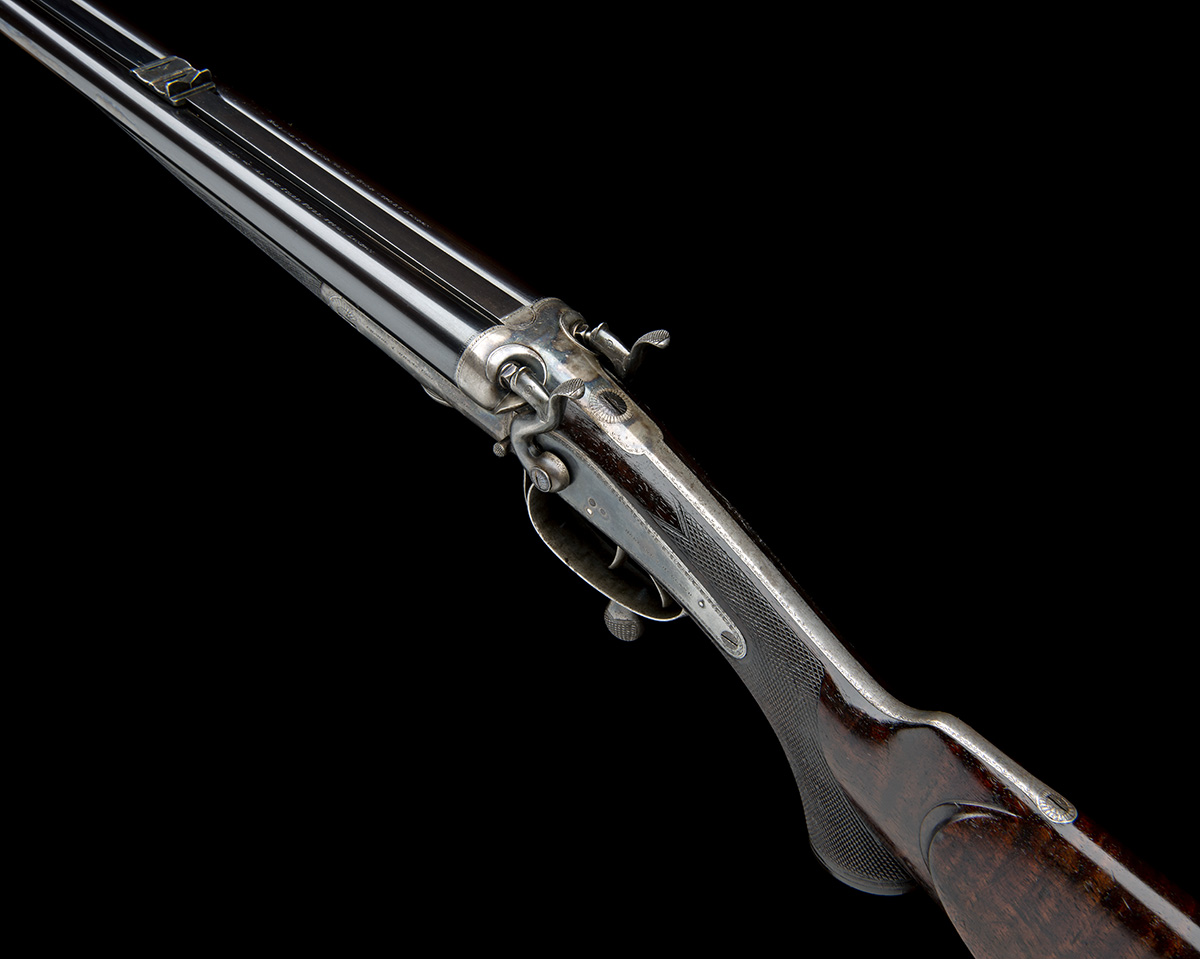 26 1/4in. black powder only barrels with partially matted rib, open sights with two folding leaf sights, marked 50/150, 200 and 250, ramped bead fore-sight, the tubes engraved 'HOLLAND & HOLLAND. 98. NEW BOND STREET. LONDON. WINNERS OF ALL THE "FIELD" RIFLE TRIALS. LONDON.', Jones patent rotary underlever, carved percussion fences, elongated top strap, rebounding back-action locks with bolted dolphin hammers, border engraving, the left side of the action bar engraved 'CHARGE 4 DRAMS CASE 3 1/4 INCHES', retaining traces of renewed colour-hardening, 14 3/4in. well-figured pistolgrip stock with cheekpiece, pistolgrip-cap, sling swivels and horn buttplate, fore-end with grip-catch release, weight 8lb. 14oz., in its leather case