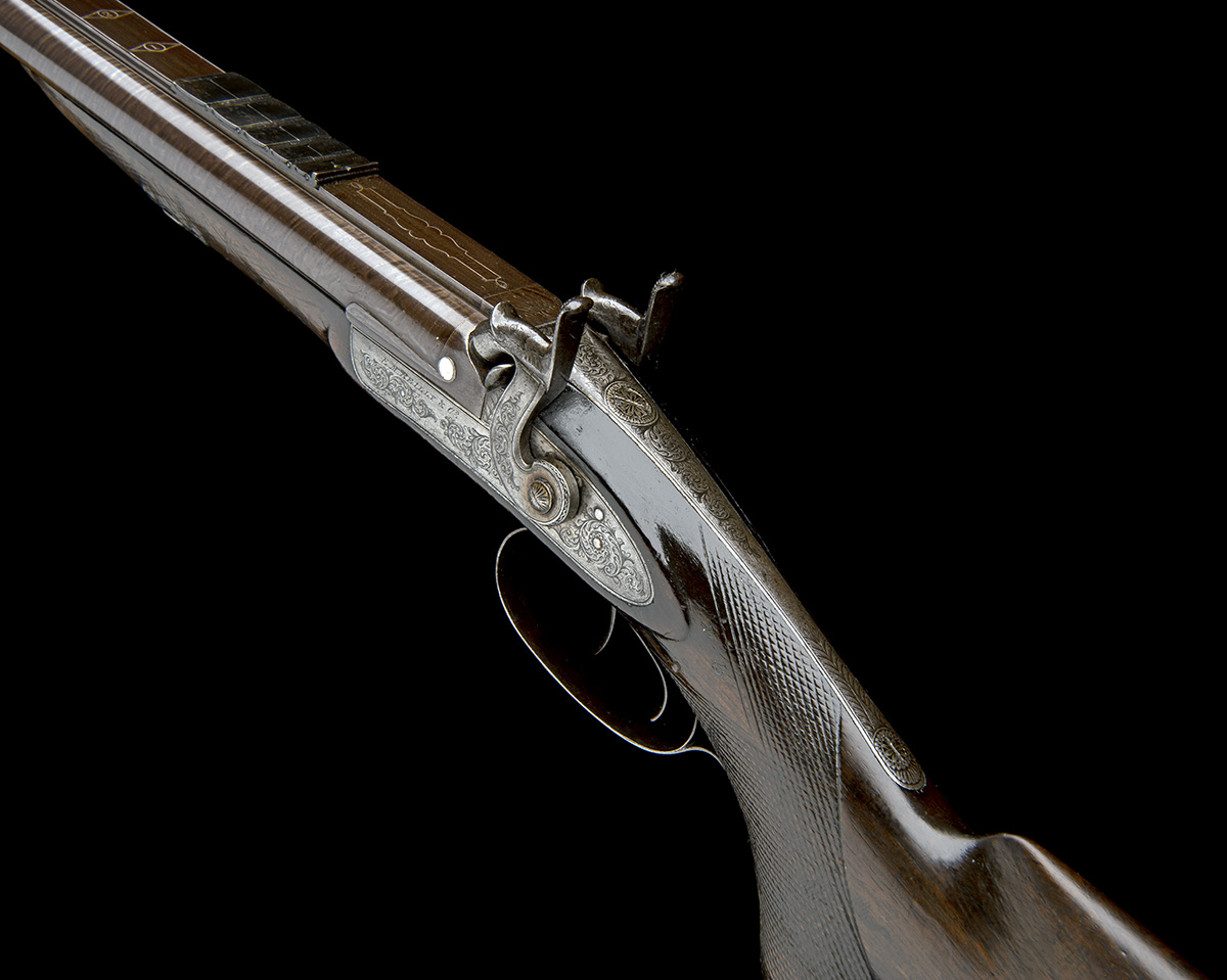 for 1859, with expertly re-browned 30in. twist barrels the broad matted raised top-rib signed 'E.M. REILLY & Co. OXFORD ST. LONDON' within an arabesque white metal lined bordered panel, the top-rib also bordered with a white metal line and marked with similarly bordered one inch increments, dove-tailed bead fore-sight, 'Africa' style rear-sight with five flush folding notched leaves, each with platinum central line, and a further shallow standing notch, shell engraved rib-end at breech, platinum plugs, borderline and scroll engraved elongated top-tang, borderline and scroll engraved bar-action locks signed 'E.M. REILLY & Co.', engraved hammers, chequered walnut pistol-grip half-stock (chequering worn smooth), engraved hinged patchbox to right side of butt, iron heel-plate, engraved moulded iron grip-cap, engraved iron trigger-guard tang and bow, single set triggers for both barrels, engraved ramrod throat, plain thimbles and nickel mounted iron ramrod (small pinned working repair behind right hand lock)