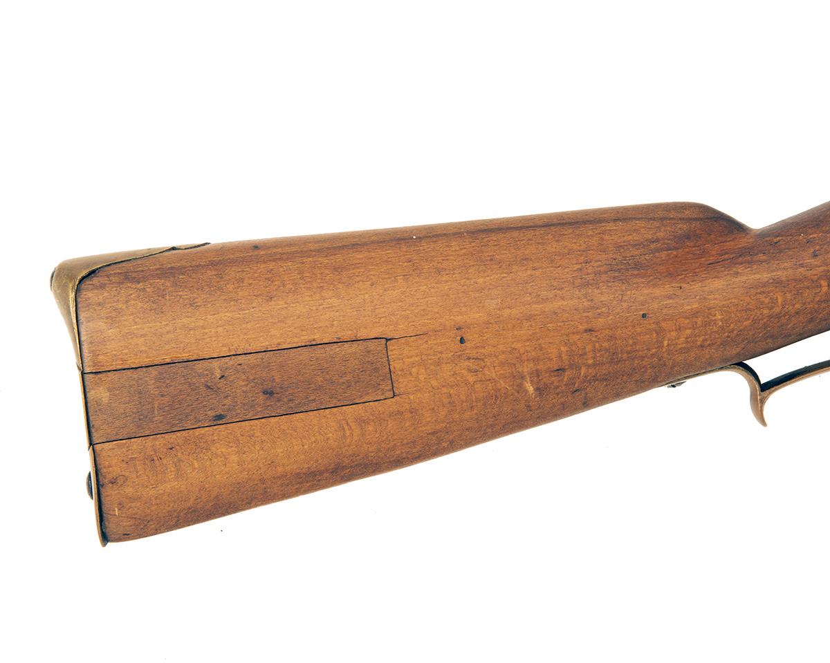 Provenance: This elusive American Civil War carbine was made in two models. The first model was sold in small batches of approximately 500 guns to two Michigan and West Virginian cavalry units. The second model was set up at the end of 1863 with an order for 6000 pieces completed in 1864. For some reason unknown, the US government declined acceptance and it is rumoured that the whole consignment was sold to an unknown European country in 1870 during the Franco-Prussian war and seemed to have completely disappeared. This is probably one of these guns after a post war refit and the brass furniture, (the originals had iron), would suggest French or Belgian usage.