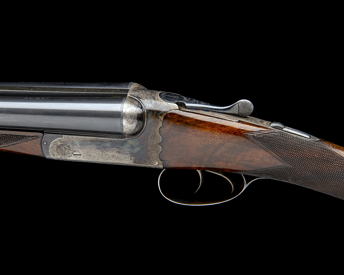 28in. nitro reproved barrels with matt rib, the tubes engraved 'WESTLEY RICHARDS & CO. LONDON.', 2 3/4in. chambers, bored approx. true cyl. in both, scroll-back action, automatic safety with gold-inlaid 'SAFE' detail, border and partial acanthus scroll engraving surrounding game scene vignettes, retaining some original colour-hardening and finish, 15 1/4in. figured stock including 1in. wooden extension, weight 6lb. 6oz., in a vinyl case
