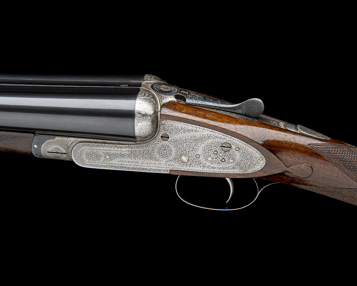 28in. nitro barrels, the rib (loose) engraved 'JOSEPH LANG & SON. 102. NEW BOND STREET. LONDON.' and gold-inlaid '1' at the breech end, 2 1/2in. chambers, bored approx. true cyl. and 1/4 choke, wall thicknesses at 19 and 19+, under rib loose, toplever gold-inlaid '1', automatic safety with gold-inlaid 'SAFE' detail, gold-inlaid cocking-indicators, fine acanthus scroll engraving with floral bouquets, brushed finish, 15 3/4in. figured replacement stock, weight 6lb. 8oz.