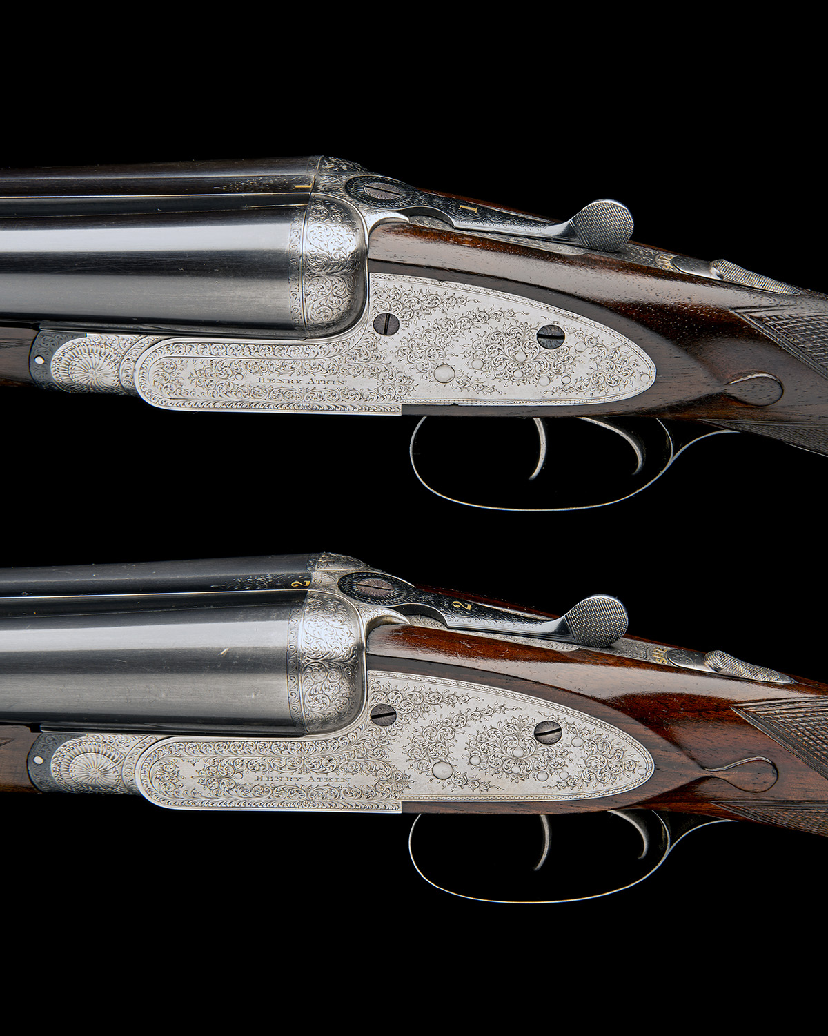 29in. replacement nitro barrels (by another), the ribs gold-inlaid '1' and '2' at the breech ends, 2 1/2in. chambers, bored approx. imp. cyl. and 1/4 choke (both), toplevers gold-inlaid '1' and '2', automatic safeties with gold-inlaid 'SAFE' details, beaded border and acanthus scroll engraving, the undersides engraved 'HENRY ATKIN FROM PURDEY'S', brushed bright, 14 3/4in. replacement stocks, No.1 fore-end wood with some repairs, weight 6lb. 12oz. (No.1) 6lb. 13oz. (No.2)