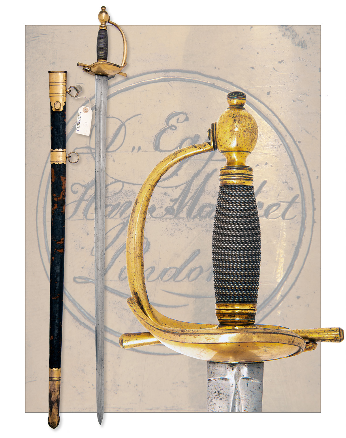 with straight 34in. double-edged blade, short blind fuller to both sides, typical gilded double boat shell guard, straight reverse taper quillions, gilded 'D' shaped knuckle-bow and gilded ovoid pommel with twisted silver wire bound grip, complete with its leather scabbard (leather distressed, stitching undone) fitted with gilded brass mounts, the throat signed within a circular borderline 'D. EGG, HAY MARKET LONDON' and bearing a collection medallion numbered '37'