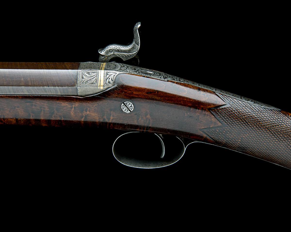 circa 1840, with rebrowned octagonal to sixteen-sided to round 32in. barrel banded at the intersection, small bead fore-sight, the colour hardened breech-block engraved and signed 'COOK, BATH' and with gold band, carved snail with gold vented plug, border and scroll engraved long top-tang, border and scroll engraved back-action lock signed 'COOK, BATH', en-suite hammer with dolphin head, birdseye maple half-stock chequered at the wrist, engraved iron furniture, white metal fore-end tip and brass mounted ebony ramrod, complete in its manufacturer's walnut case compartmented and lined in green baize, small parchment trade label inside lid and containing two flasks and three wad punches