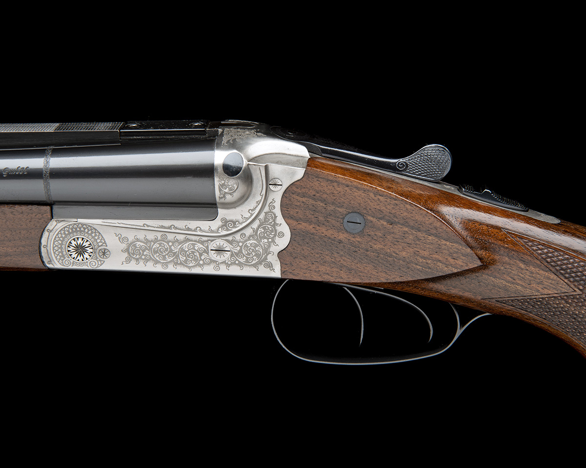 23 1/2in. nitro barrels with stepped raised solid matt rib, open sights with two folding leaf sights, ramped bead fore-sight, scroll-back treble-grip action with side-bolsters, removable striker discs, manual safety, Germanic scroll engraving, bright and blued finish overall, 15in. pistolgrip stock including 1/2in. rubber recoil pad, with cheekpiece, pistolgrip-cap and sling swivels, weight 11lb., in a universal case and with original paperwork