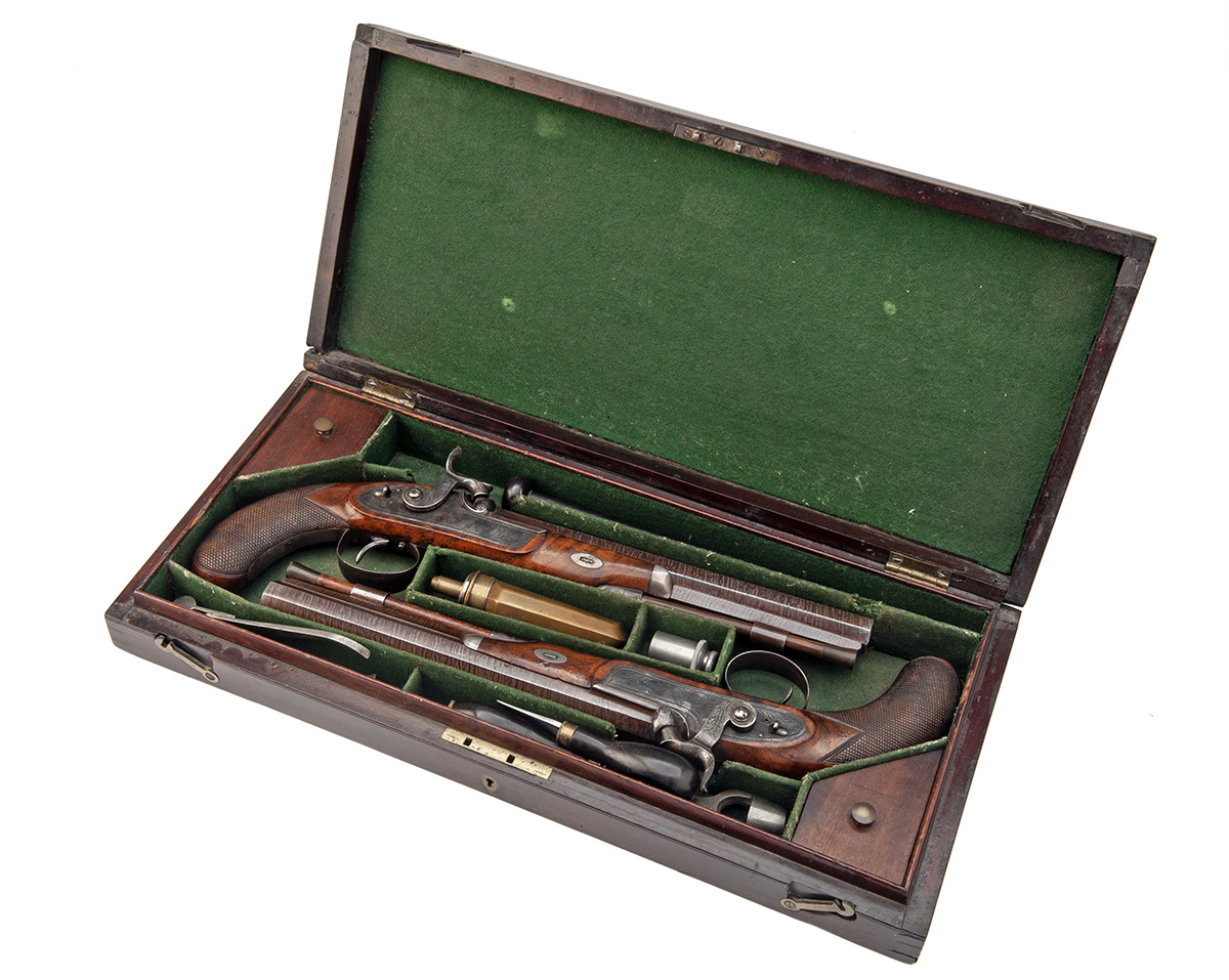 circa 1828, with rebrowned twist 10in. octagonal barrels signed in script on the top-flats 'OXFORD' (rubbed), bead fore-sights, standing notch rear-sights, knock-off breech-blocks with moulded snails, top-tangs engraved with acanthus leaves, border and acanthus leaf engraved flat locks with sliding safes behind the engraved slab-sided hammers and signed 'FORREST', walnut half-stocks with chequered bag-shaped butts, engraved trigger-guards, single set triggers, white metal barrel key escutcheons and nose-caps, horn tipped under-barrel ramrods and complete in their probable original mahogany storage case relined in antiquity in green baize and containing the pistols together with a powder flask, turn screw, wad punch, loading rod and scissors mould