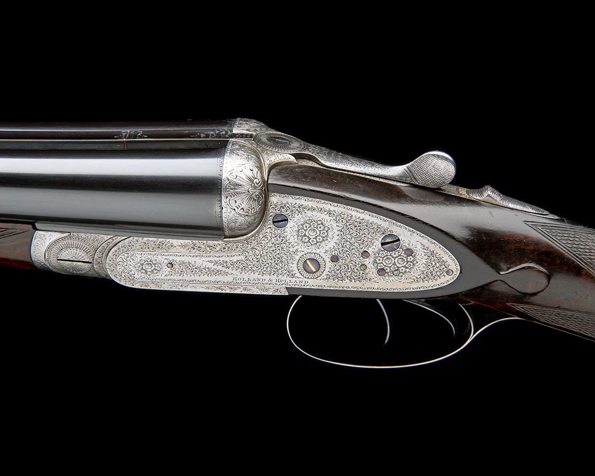 28in. replacement nitro barrels (by another in 1970), 2 3/4in. chambers, bored approx. imp. cyl. and 1/2 choke, H. Holland and J. Robertson patent barrel cocking action, patent no. 23 of 1883, patent gas checks, toplever engraved 'PATENT EJECTOR', automatic safety with gold-inlaid 'SAFE' detail, gold-inlaid cocking-indicators, border, bouquet and scroll engraving, brushed bright finish, pins reblued, 15 1/4in. figured replacement stock, replacement fore-end wood, weight 6lb. 7oz.
