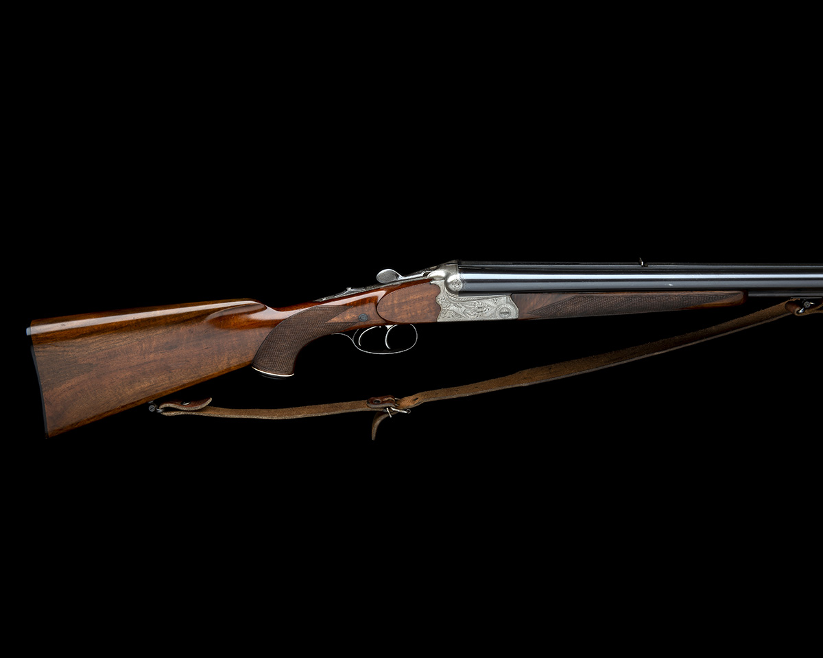 23 1/2in. nitro reproved barrels (in 2020), solid raised matt rib engraved 'FRANZ SODIA FERLACH' with flip up open sights and slightly ramped bead foresight, 2 3/4in. shot chambers, bored approx 1/2 and 3/4 choke, bolstered scroll-back treble-grip action with side-clips, removable striker discs, tang mounted shot / ball selector switch, manual side safety, set front trigger, bold Germanic scroll engraving with game scenes of stag and hare, silver and blue finish overall, 14 1/4in. pistolgrip stock with cheekpiece, pistolgrip-cap, sling swivels and buttplate, weight 7lb. 10oz.