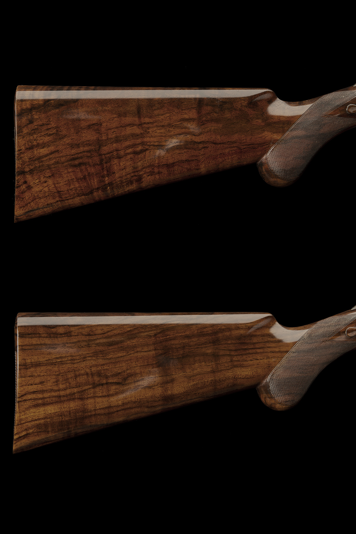 26in. nitro chopperlump barrels with short sight ribs gold-inlaid '1' and '2' and ramped bead fore-sights, side-ribs, the over barrels engraved 'J. PURDEY & SONS. AUDLEY HOUSE. SOUTH AUDLEY STREET. LONDON. ENGLAND.', 2 3/4in. chambers, bored approx. imp. cyl. and 1/4 choke, the extra pair of 26in. nitro reproved chopperlump barrels with short sight rib gold-inlaid '1' and ramped bead fore-sight, side-ribs, the over barrel engraved 'J. PURDEY & SONS. AUDLEY HOUSE. SOUTH AUDLEY STREET. LONDON. ENGLAND.', 2 3/4in. chambers, Teague multichokes (with spares), carved fences, toplevers gold-inlaid '1' and '2', automatic safeties with gold-inlaid 'SAFE' details, cocking-indicators, engraved with acanthus scrollwork and floral bouquets, the undersides with 'J. PURDEY & SONS. LONDON. ENGLAND.', retaining traces of original colour-hardening and finish, 15in. figured replacement pistolgrip stocks, weight 7lb. 6oz., in their brass-cornered leather case with accessories and canvas and leather outer, together with their original straight hand stocks