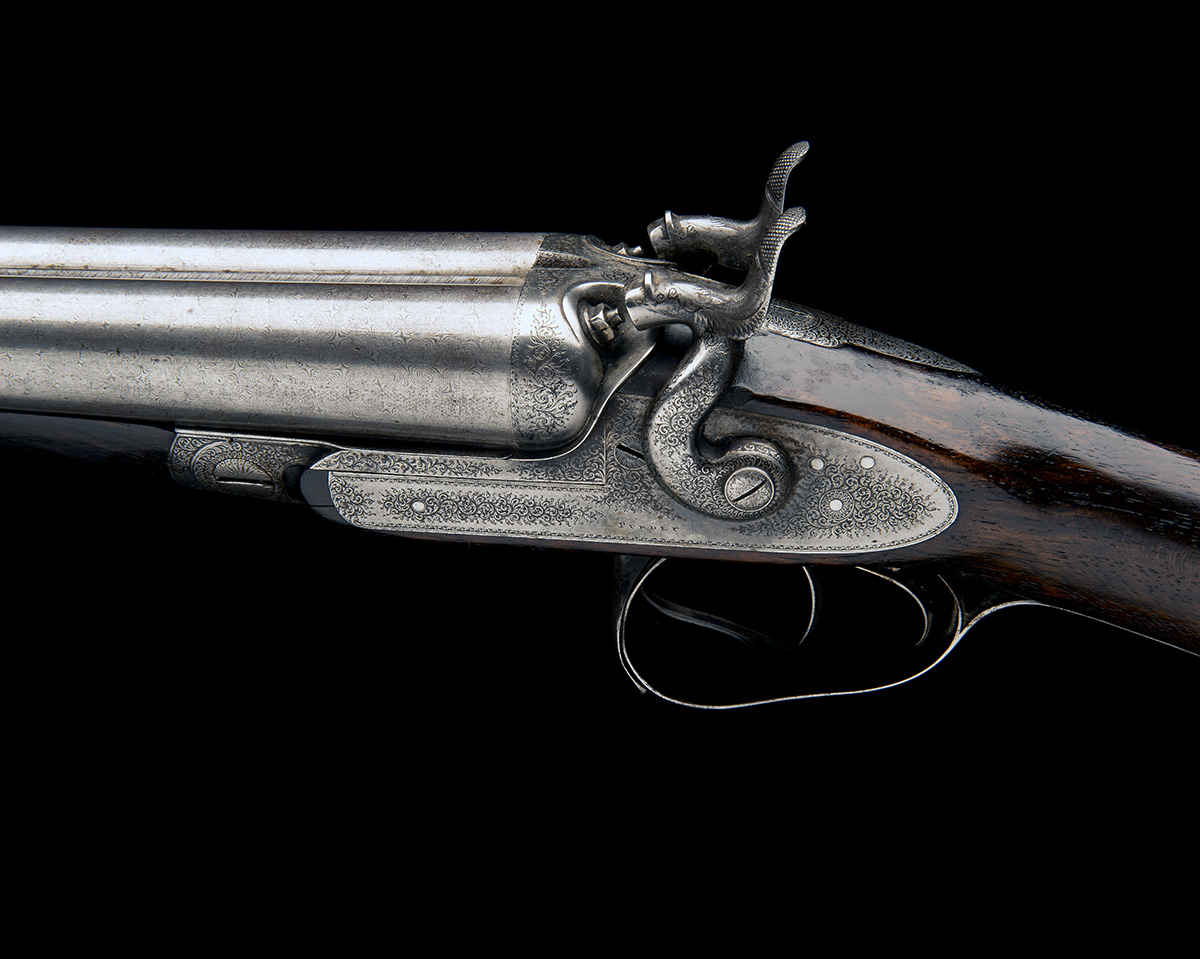 31in. black powder only fine damascus barrels, sunken rib engraved 'J. PURDEY 314 1/2 OXFORD STREET. LONDON', and '2', 2 1/2in. chambers, bored approx. true cyl. in both, action incorporating J. Purdey 1863 second pattern thumbhole underlever and Purdey 1863 double bite, patent no. 1104 of 2nd May 1863, carved percussion fences, rebounding sidelocks with dolphin hammers, fine acanthus scroll engraving, the underside with 'PURDEY'S PATENT', bifurcated triggerguard engraved 'PATENT SAFETY' (likely refers to Purdey patent trigger locking safety, patent no. 3118 of November 28th 1870 - not functioning), retaining very slight traces of colour-hardening, 14 1/4in. figured stock (chequering worn smooth, minor damage), weight 6lb. 15oz.