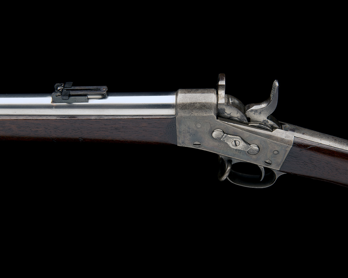 manufactured 1872, with brushed bright (as original) 36in. barrel, block and blade fore-sight, small elevating ladder rear-sight, colour hardened rolling block action marked 'MODEL 1871' on the left hand side and 'US SPRINGFIELD 1872' below an American eagle on the right, special 'locking' central hammer action (hammer deliberately drops to half-cock when breech closed), top-tang marked with 'REMINGTON'S PATENT' over 'PAT MAY 3D. NOV 15TH 1864. APRIL 17TH 1868', walnut butt-stock with 'U.S' marked heel-plate, iron sling swivels and two barrel-bands, complete with matching socket bayonet (unmarked, no scabbard)