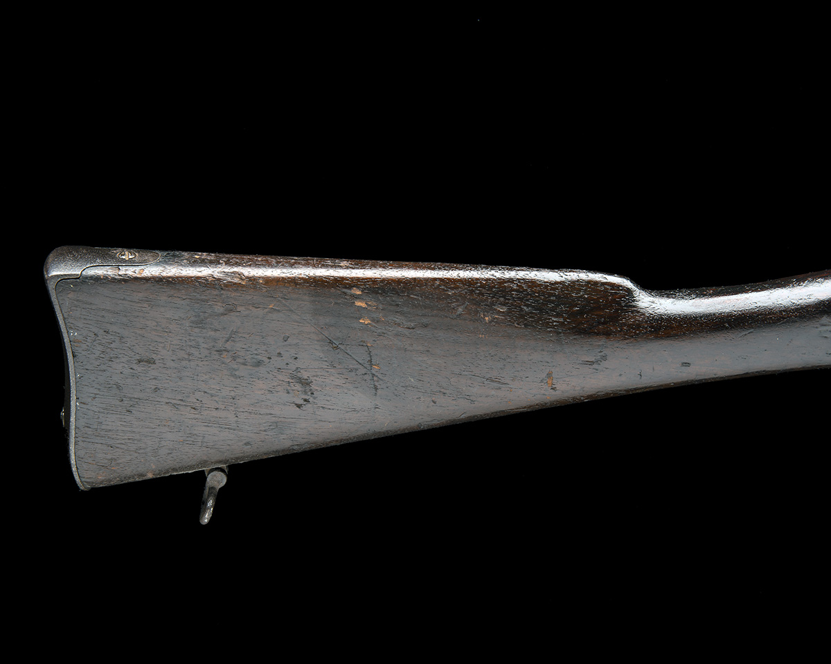 circa 1863, with blued 21 1/2in. octagonal to round barrel hinged at the breech, blade fore-sight with nickel insert, small folding ladder rear-sight with sliding notch, boxlock action with external hammer and barrel-latch released by auxiliary trigger within the trigger-guard, the side of action marked variously 'MANUFACTURED BY MASS ARMS CO., CHICOPEE FALLS', 'ADDRESS POULTNEY & TRIMBLE, BALTIMORE USA' and 'SMITH'S PATENT JUNE 22 1857', straight-hand walnut butt-stock (heavily bruised), iron furniture, plain walnut fore-end (bruised, some fraying to sharp edges) with single barrel-band, the whole stained over possible original finish