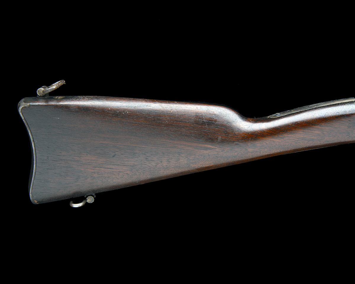 manufactured 1864-65, with 22in. round barrel, pinched blade fore-sight, elevating ladder rear-sight, slab-sided rounded-top and bottom, the breech side marked 'KENTUCKY', slab-sided central hammer receiver signed 'MERIDEN MAN.FG. CO., MERIDEN, CONN.', the top-tang marked 'TRIPLETT & SCOTT PATENT DEC. 6 1864' and mounted with the barrel-release button, sprung trapdoor for the concealed tubular magazine in the butt, walnut butt-stock with iron heel-plate (crack at head around magazine tube), sling swivels mounted at heel and toe and walnut splinter fore-end with singular iron barrel-band, much original colour and finish remaining