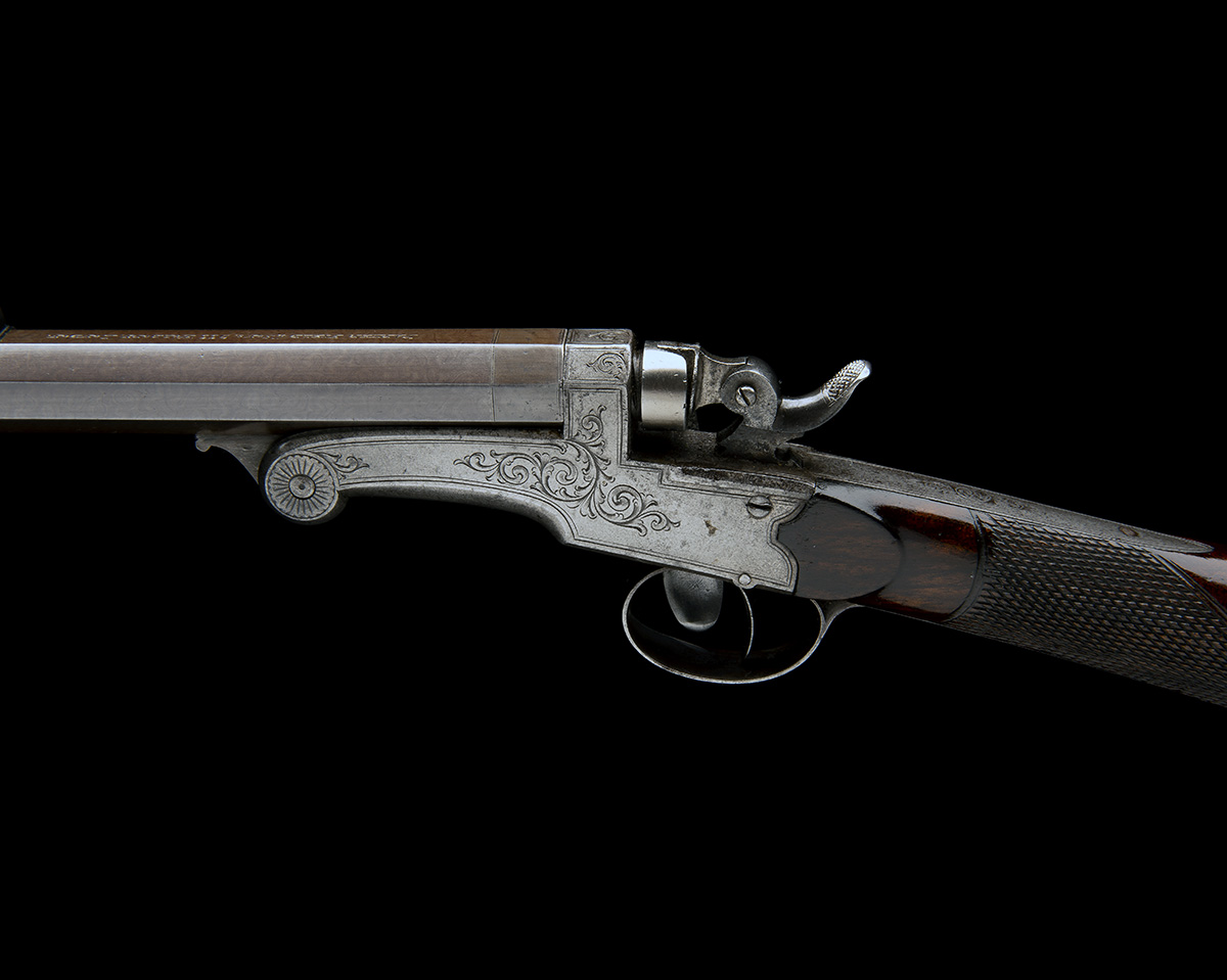 circa 1860, with octagonal break-open browned damascus 24 1/2in. barrel signed 'PARKER, FIELD & SONS, 233 HOLBORN, LONDON', micro-groove rifling, blued dove-tailed blade fore-sight, rear-sight with one standing and two folding leaves, faceted butter-knife bolt-handle with chequered tip, the boss marked 'E19 R&N PATENT' (repair to bolt handle aperture), borderline engraved applied breech, borderline and scroll engraved colour-hardened action (colour faded), central hammer with screw needle release, chequered straight-hand walnut butt-stock, smooth iron heel-plate, engraved iron trigger-guard bow, dipping front to action body with wingnut hinge-pin for taking down, no provision for fore-end, good amount of original finish throughout and in its fitted oak case with Parker, Field & Sons parchment label inside lid and compartmented and lined in green baize, some contents including sundry cleaning equipment and a pewter oil bottle