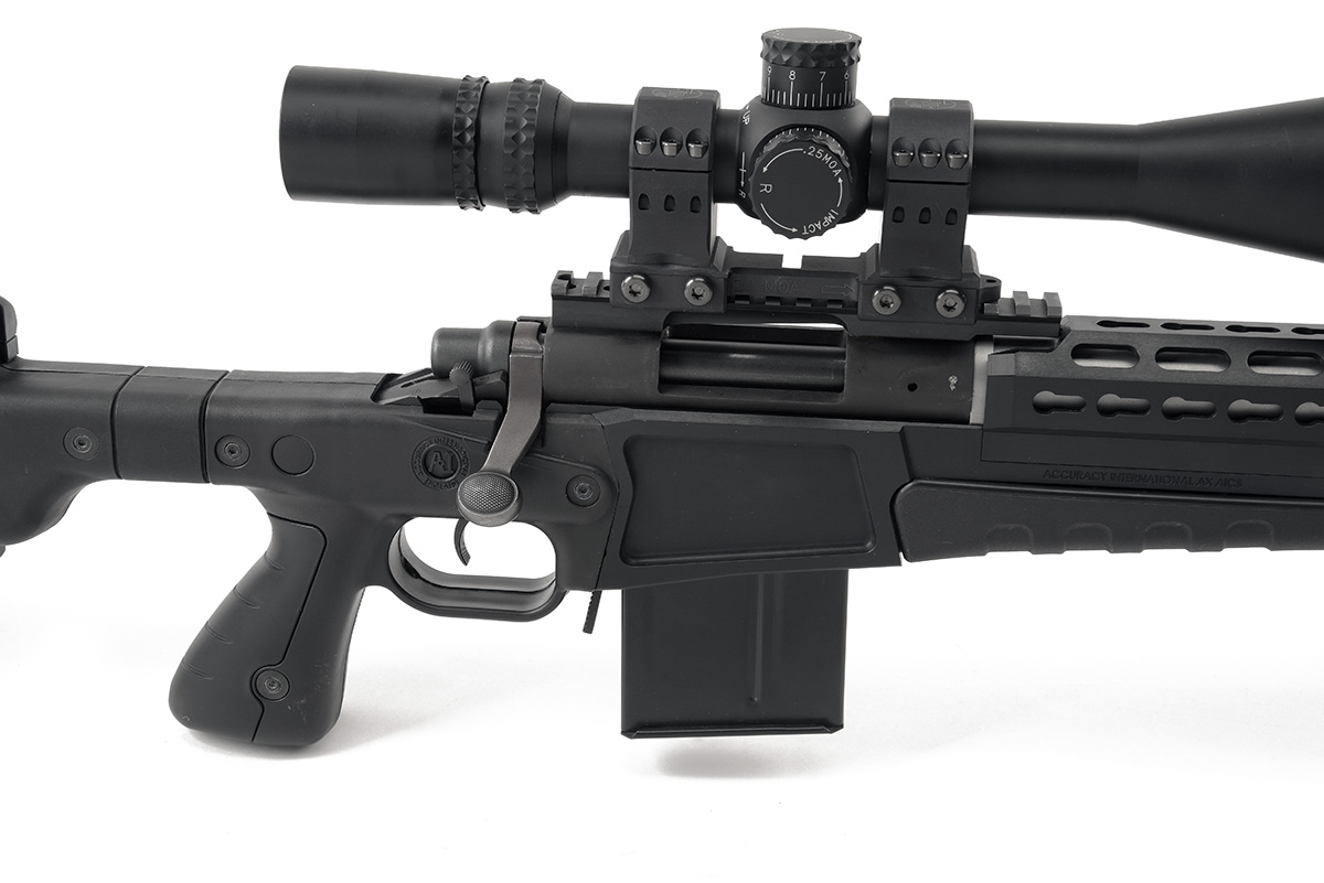 32in. unsighted nitro barrel, the receiver mounted with a Nightforce NXS 12-42x56 telescopic sight, serial no. T09640, on a picatinny rail mount and with sun shade scope extension, detachable box magazine (comes with two five shot and two ten shot magazines), Accuracy International AX stock, the fore-end with a Fortmeier over barrel bipod, weight 18lb. 14oz., in a padded canvas carry bag