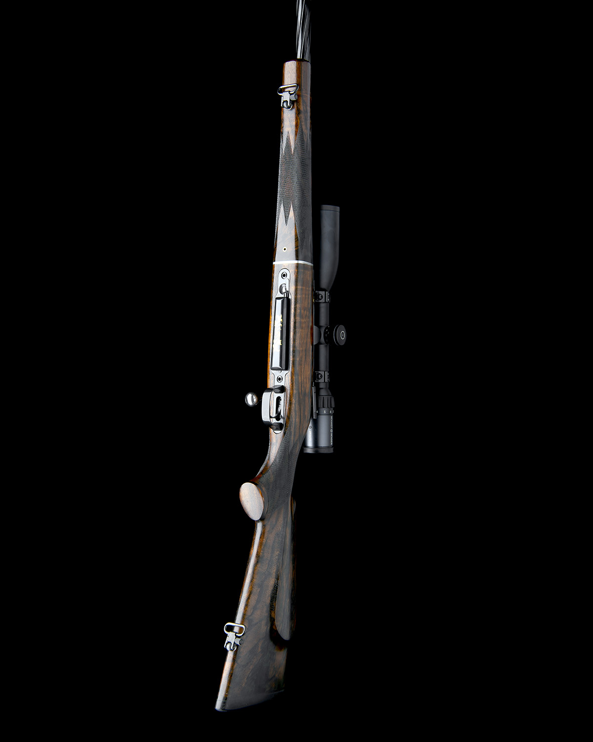 25in. nitro reproved (in 2020) unsighted spiral fluted barrel, numbered P12664, the receiver mounted with a Schmidt & Bender 3-12x50 Zenith telescopic sight, serial no. 290472, fore-end detaches, barrel currently fixed, the receiver inlaid in gold with stylised acanthus motifs, detachable box magazine inlaid en suite, well-figured pistolgrip stock with cheekpiece and monte carlo comb, palm swell, sling swivels, 14in. pull including 1/2in. rubber recoil pad, weight 8lb. 7oz. (unscoped) and 10lb. 5oz. (with scope)