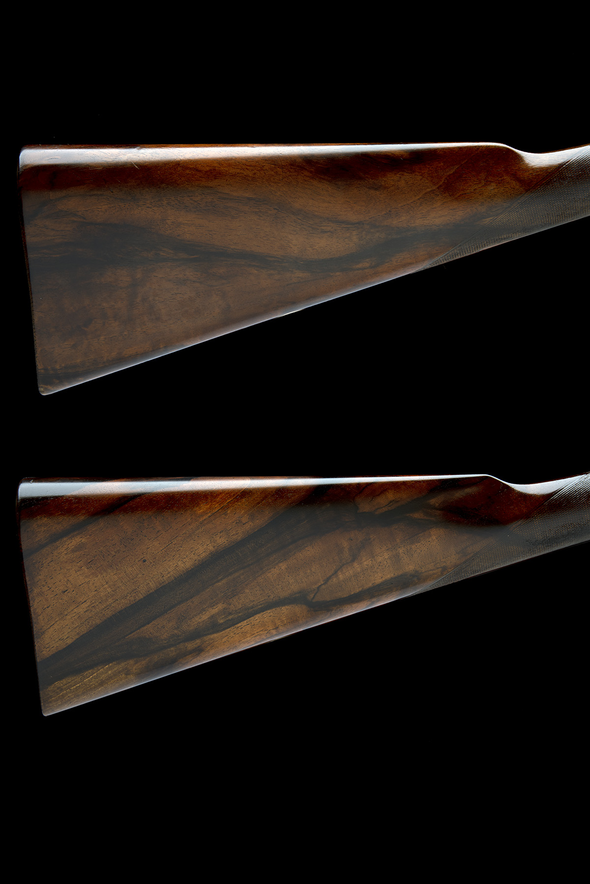 for 1902, 28in. replacement nitro barrels (in 1965), the tubes engraved 'HENRY ATKIN LTD. 7. BURY STREET. ST. JAMES'S, LONDON ENGLAND', the ribs gold-inlaid '1' and '2' at the breech ends, 2 1/2in. chambers, bored approx. 1/4 choke both (No.1) and 1/4 and 1/2 choke (No.2), No.1 left wall thickness at 19, toplevers gold-inlaid '1' and '2', automatic safeties with gold-inlaid 'SAFE' details, chequered front triggers, best fine acanthus scroll engraving with beaded bordering, the action flats engraved 'E.C. HODGES', brushed bright and reblued finish overall, 15 1/4in. boldly-figured replacement stocks (in 1965), No.2 stock with minor setting cracks to rear of lockplates, weight 6lb. 8oz. (No.1) and 6lb. 9oz. (No.2), in their brass-cornered oak and leather case