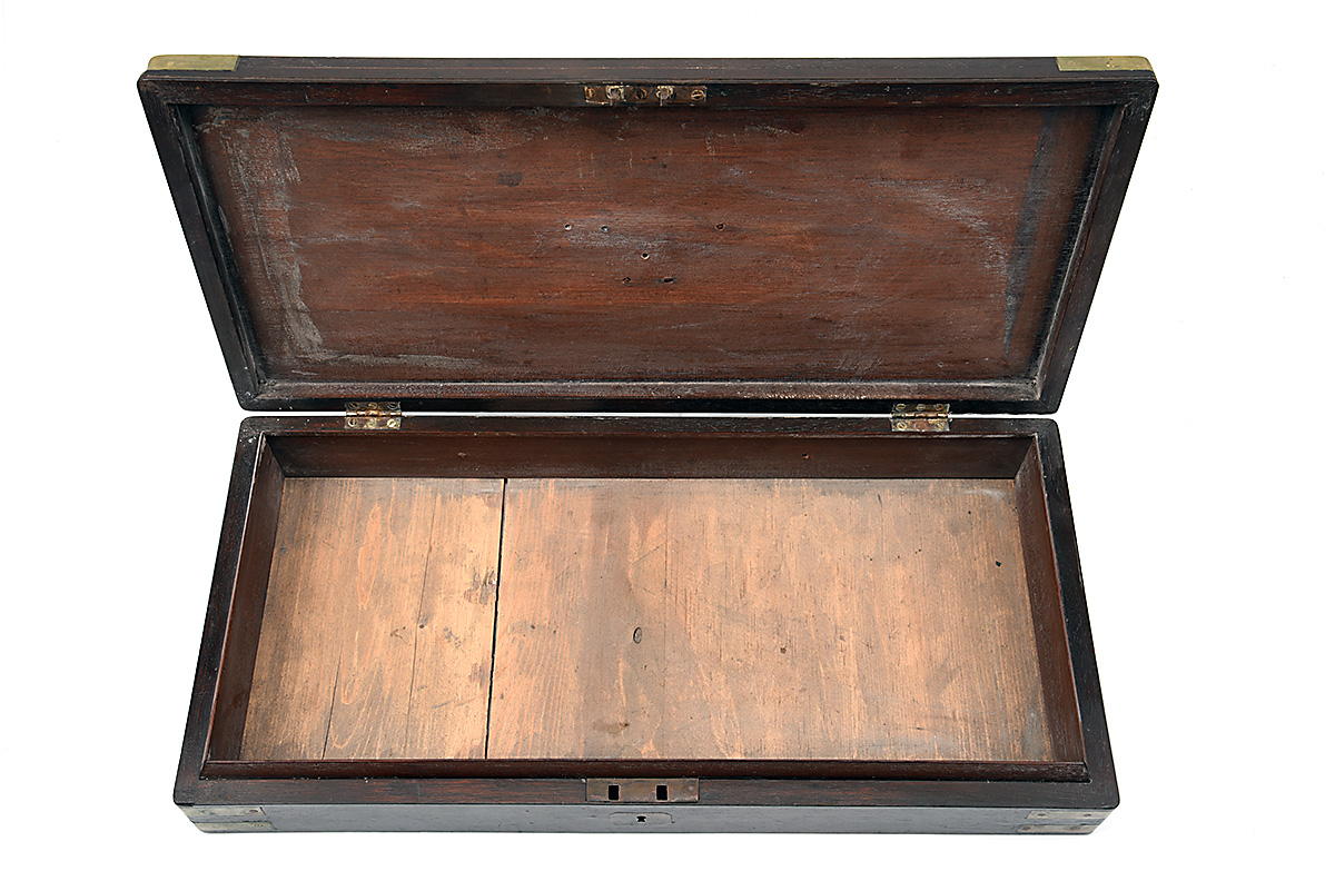 first quarter of the 19th century, measuring externally 19 1/4in. x 9in. x 3in., rounded brass corners to lid with twin brass reinforcing bands to each corner of tray, flush-fitting rectangular handle to outer lid, clipped corner rectangular escutcheon to lock, the lining and all internals completely removed and absent, no key