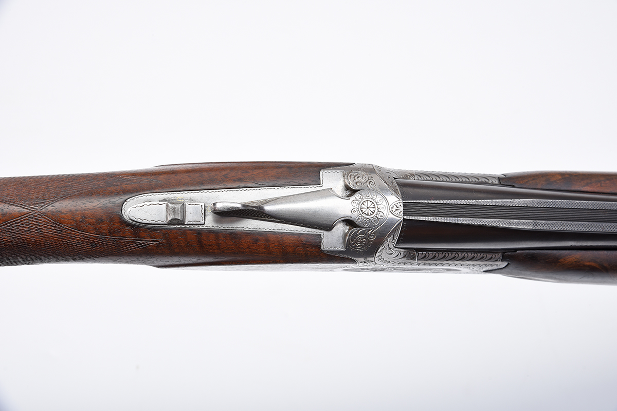 FABRIQUE NATIONALE 12-BORE 'B2' SINGLE-TRIGGER OVER AND UNDER EJECTOR, serial no. 30444S74, for 1974, 27 1/2in. nitro barrels with 12mm ventilated matt top-rib, 2 3/4in. chambers, bored approx. true cyl. in both, hold-open toplever, manual safety with integral barrel selector switch, chequered gold-washed trigger, acanthus scroll engraving surrounding game scenes of pheasant and duck, signed 'R. BEE' to the left, 14 3/8in. pistolgrip stock including buttplate, weight 7lb. 5oz.