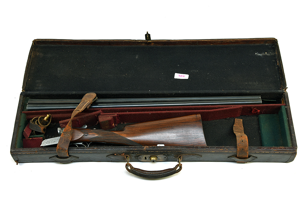 WILLIAM FORD 12-BORE BOXLOCK EJECTOR, serial no. 5981, for 1899, 28in. replacement nitro reproved barrels (in 2025), the tubes engraved 'W.G. RICHARDSON. BARNARD CASTLE.', the rib engraved 'MADE OF SIR JOSEPH (WHITWORTH'S) FLUID COMPRESSED STEEL.', and with acanthus scroll detailing at the breech-end, 2 3/4in. chambers, bored approx. 1/2 and full choke, treble-grip action with hidden third-bite, the action flats marked 'PATENT 4289. 1886. 9797.', being Deeley's patent ejector patent no. 4289 of 1886, use number 9797, removable striker discs, automatic safety with gold-inlaid 'SAFE' detail, intercepting sears, beaded border with acanthus scroll engraving, the makers name in a scrolling banner, brushed bright and re-blued finish overall, 14 7/8in. replacement stock, fore-end with Anson push rod with gold-inlaid 'PUSH' detail, weight 6lb. 6oz., in a lightweight single leather guncase