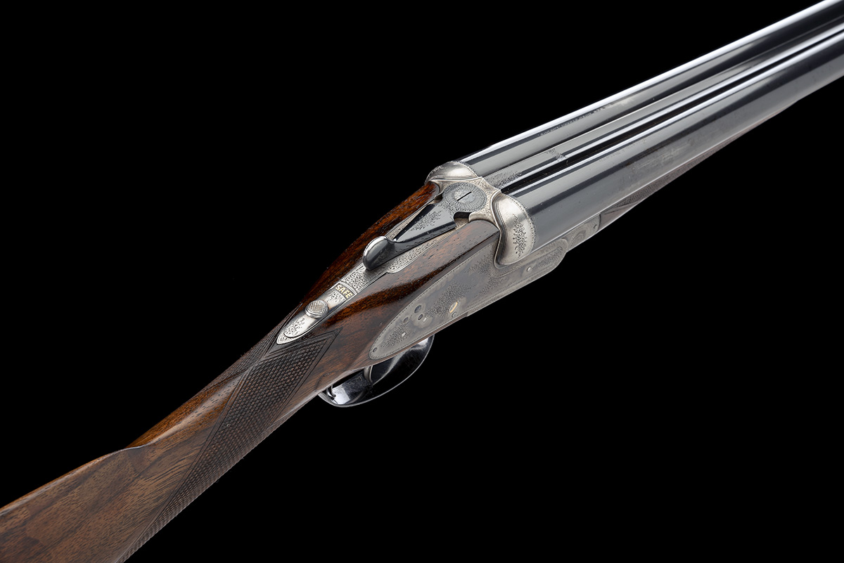 circa 1914, 30in. nitro barrels (loose on action), the tubes engraved 'HOLLAND & HOLLAND. 98. NEW BOND STREET. LONDON.', 2 1/2in. chambers, bored approx. true cyl. and 1/4 choke, automatic safety with gold-inlaid 'SAFE' detail, hand-detachable lockplates, gold-inlaid cocking-indicators, fine border and acanthus scroll engraving, that action flats engraved 'HOLLAND'S PATENT', retaining some original colour-hardening, 15 1/4in. stock (crack at hand) including 2in. wooden extension, weight 6lb. 11oz., in its lightweight leather case