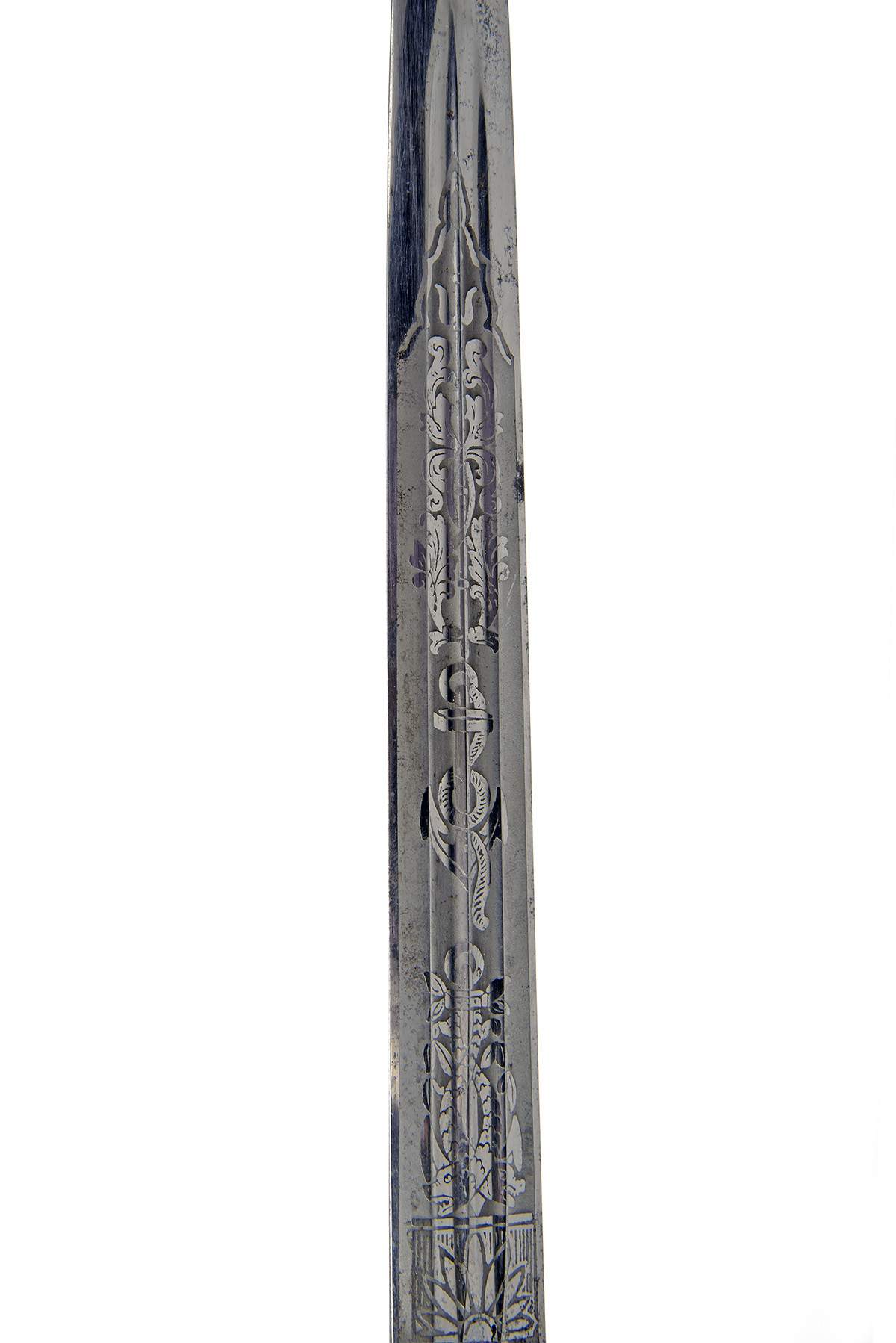 circa 1937, with 10in. stiletto blade etched with floral devices, arabesques and fouled anchors, twin narrow blind fullers to both sides, squared ricasso with maker's mark at forte, carved and gilded cross-guard with central anchor devices and a push-button scabbard lock, wire-bound cream-coloured celluloid grip and eagle and swastika pommel, complete with its brass scabbard embossed with lightning bolts and fitted with twin loose suspension rings